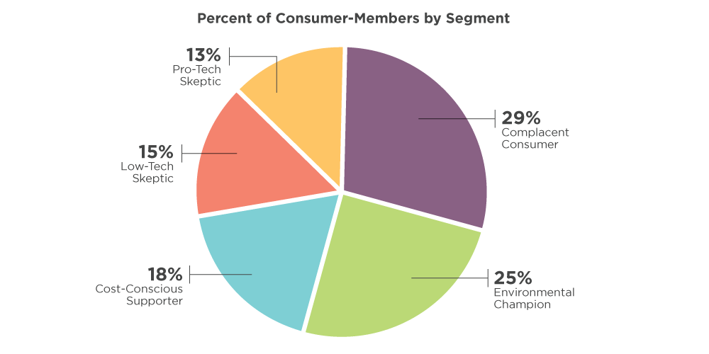 In order to help co-ops gain a better understanding of their consumer-members, NRECA recently conducted a segmentation study with the consumer-members of 19 distribution co-ops. The analysis identified five distinct segments among the consumer-members along with a predictive model, that can determine a member’s segment by asking 10-questions focused on their attitudes and beliefs related to the climate, renewable energy, energy efficiency, technology and media usage. The segments identified are shown in the chart below.